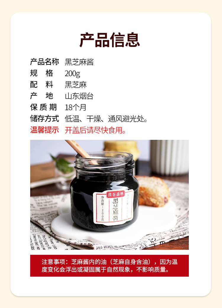 熊爸森林 原味黑芝麻酱芝麻酱低温烘焙石磨芝麻辅食调料酱