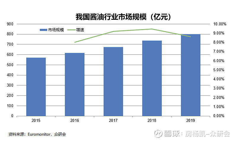 酱油行业的市场规模为食醋行业的5倍左右。Euromonitor数据显示,我国酱油行业市场规模从2015年570.67亿元已增长至2019年约800亿元的水平,期间复合增速约为8.8%,整体增长稳定。