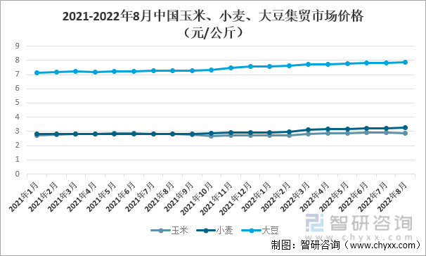2021-2022年8月中国玉米、小麦、大豆集贸市场价格