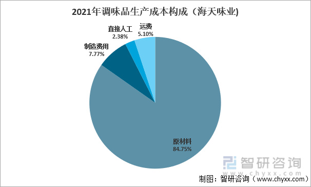 根据调味品龙头企业海天味业2021年财报来看,调味品的生产成本由原材料、制造费用、直接人工和运费构成,其中原材料是最主要的生产成本,占总成本比重高达84.75%。