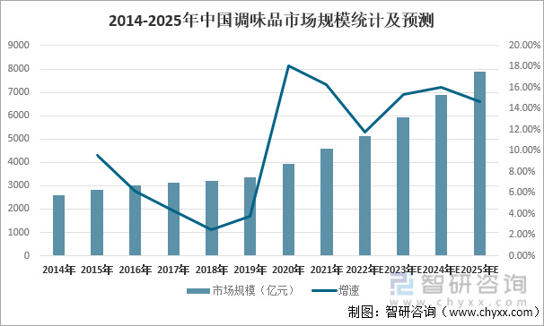 随着我国经济的高速发展。人均可支配收入逐年增长,生活消费转型升级,调味品行业伴随着消费升级稳健增长。数据显示,2021年我国调味品行业市场规模达4594亿元,较2020年增加644亿元,同比上升16.3%,预计2025年我国调味品市场规模将达到7881亿元。