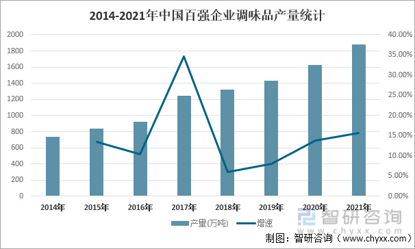 近些年,中国的调味品工业获得了迅猛发展,成为食品行业中新的经济增长点。企业在保障产品质量的同时使产品形成了规模化生产,产量大幅增长。中国调味品协会数据显示,2014-2021年中国百强企业入调味品产量连年增长,2021年百强企业调味品产量达到1882.6万吨,同比增长15.7%。