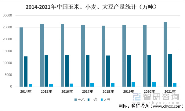 调味品行业主要的原材料为大豆、玉米、小麦等粮食产品,部分为肉类制品。国家统计局数据显示,2014-2021年,我国玉米和小麦的产量小幅度上升,整体较为稳定,大豆产量在2021年有所下降,主要是由于大豆的产量走势跟播种面积趋势一致,而2021年我国大豆的播种面积下降至8400千公顷。2021年,我国玉米、小麦、大豆的产量分别为27255.06万吨、13694.45万吨、1640万吨,玉米、小麦的产量同比上升4.56%、2%,大豆的产量同比下降16.33%。