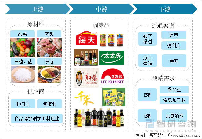 调味品的上游原材料主要由蔬菜、肉类、白糖、盐、五谷等各类农副产品组成,中游调味品企业将原材料通过各类工艺加工制造,通过包装业供应商和食品添加剂供应商提供的食品包装和食品添加剂,最终制成酱油、食醋、耗油等不同品类的调味品,下游主要通过线上线下双渠道流通到以餐饮业、食品加工业为主的B端和以家庭消费为主的C端消费需求市场。