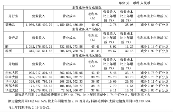主营业务分产品情况方面,醋营收13.42亿元,同比上涨8.92%、毛利率占比45.41%、同比下降1.41%;料酒营收3.15亿元,同比上涨28.57%,毛利率占比34.44%,同比下降1.92%。